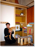 | A氏 ) | ええ、3匹がそれぞれのすまいの空間を保てるようにしたり、天井まで一気に上って行けるようにしたり、窓辺でうつらうつらできるようにしたり。外に出せませんから、トイレのしつけもしています。 爪とぎはロフト部分にじゅうたんを敷いてそこがもっぱらお気に入りのようです。 ハンディホームの建物は木製なので細工が比較的簡単で内装も自分流にアレンジできるのがうれしいですね。 それに森さんのアドバイス通り内装の壁材空間に断熱材を入れたので寒暖差が大きくなく、ねこにとっても生活しやすいみたいです。 実はわたしも毎晩ここでねこたちと寝起きしているんです。快適です。気持ちが安らぐというか。 |